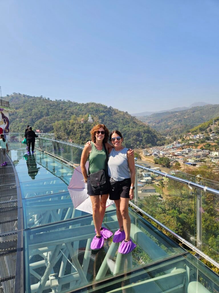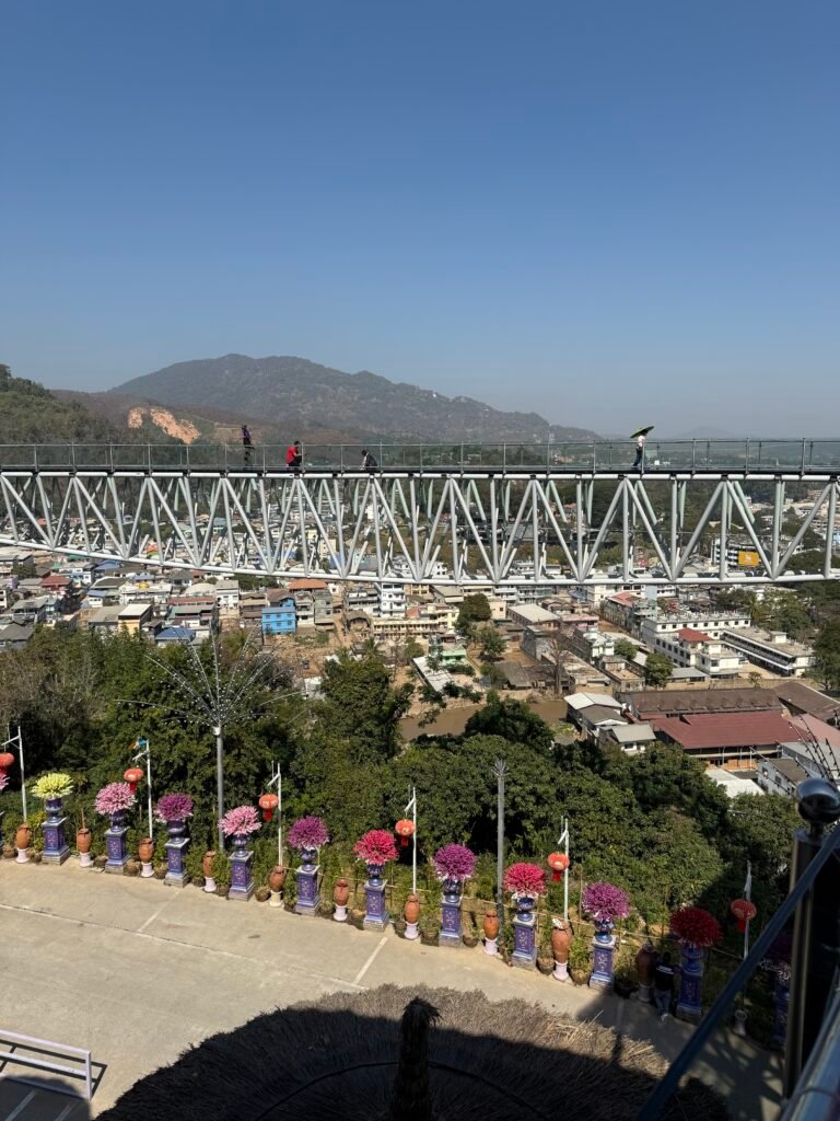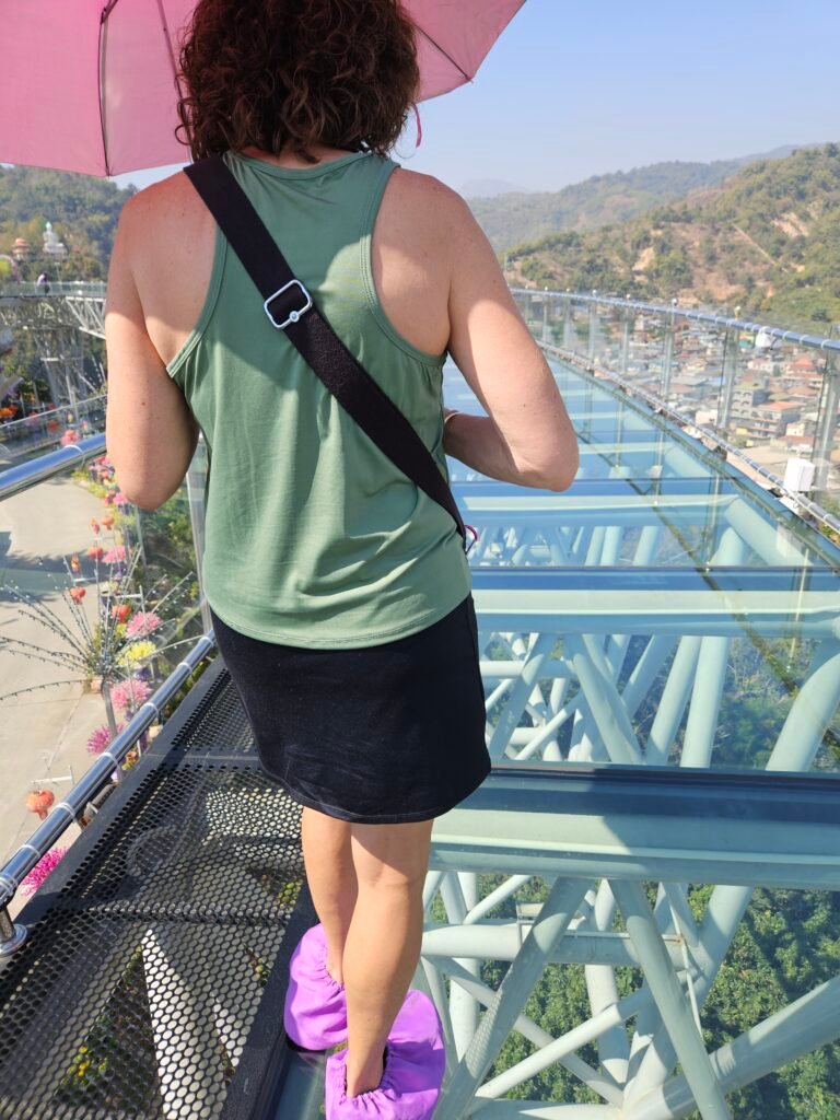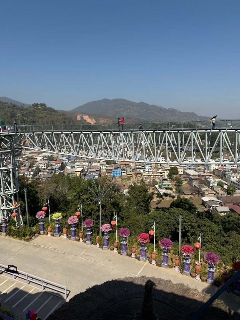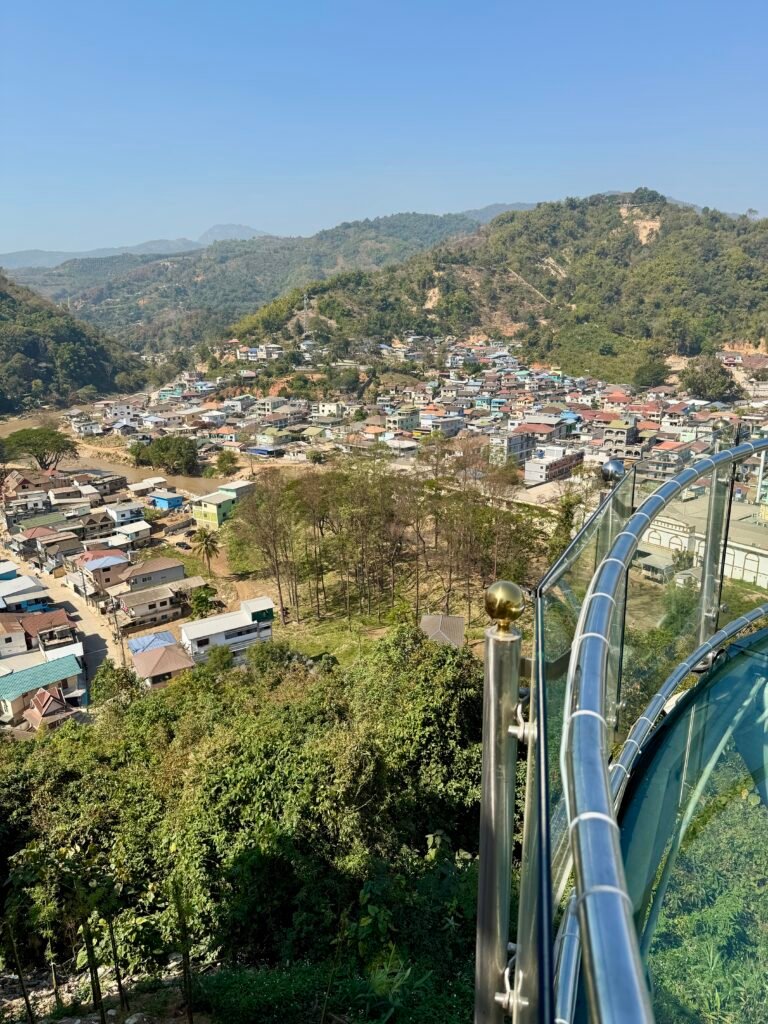 One of the best ways to see the Golden Triangle is a trip to the Skywalk. It is more than a bit scary, but the area before the skywalk is built up and there is a beautiful purple temple after the skywalk. They keep the skywalk so clean, you have to wear purple shoe covers. It reminds me over the Grand Canyon West overlook. Skywalk Mae Sai Border, between Thailand and Myanmar.
