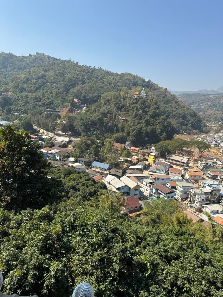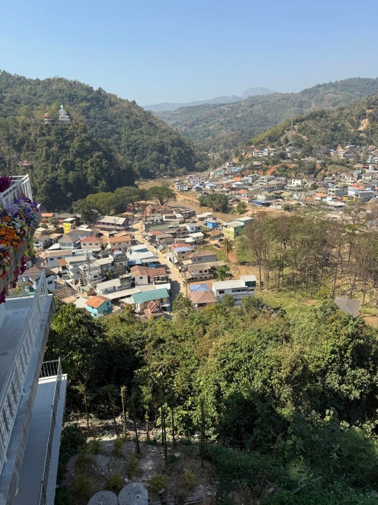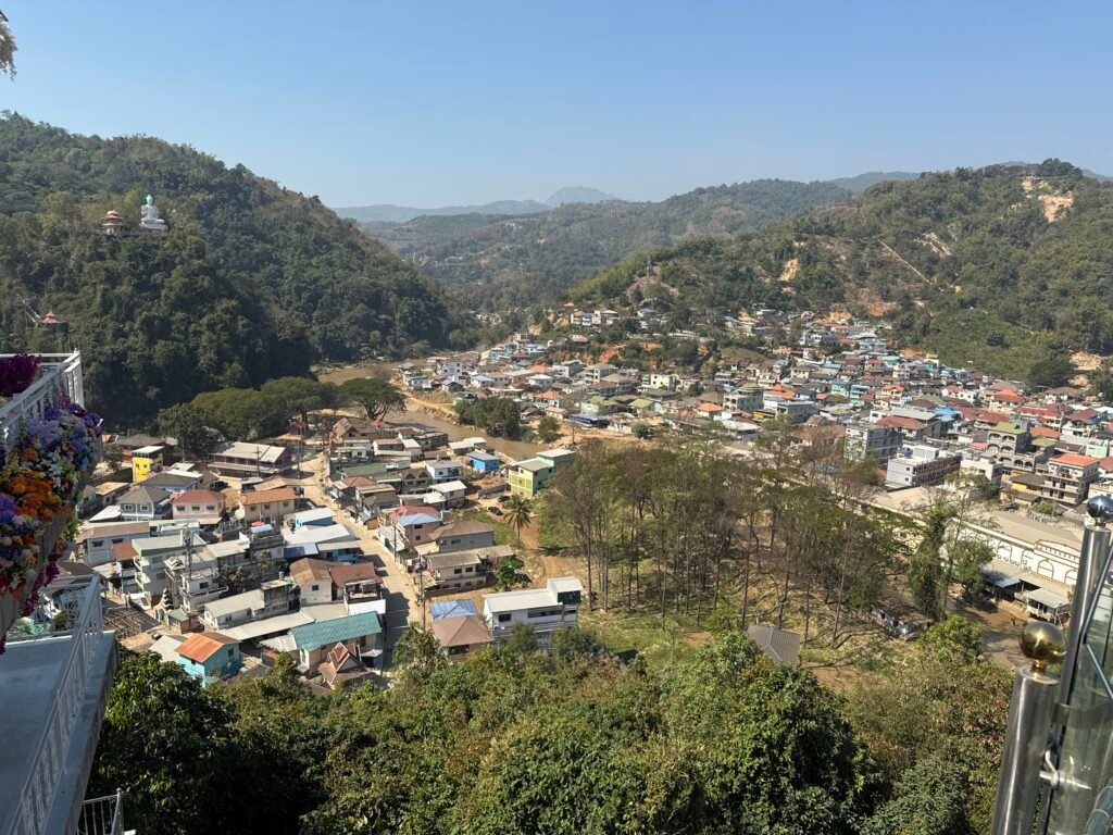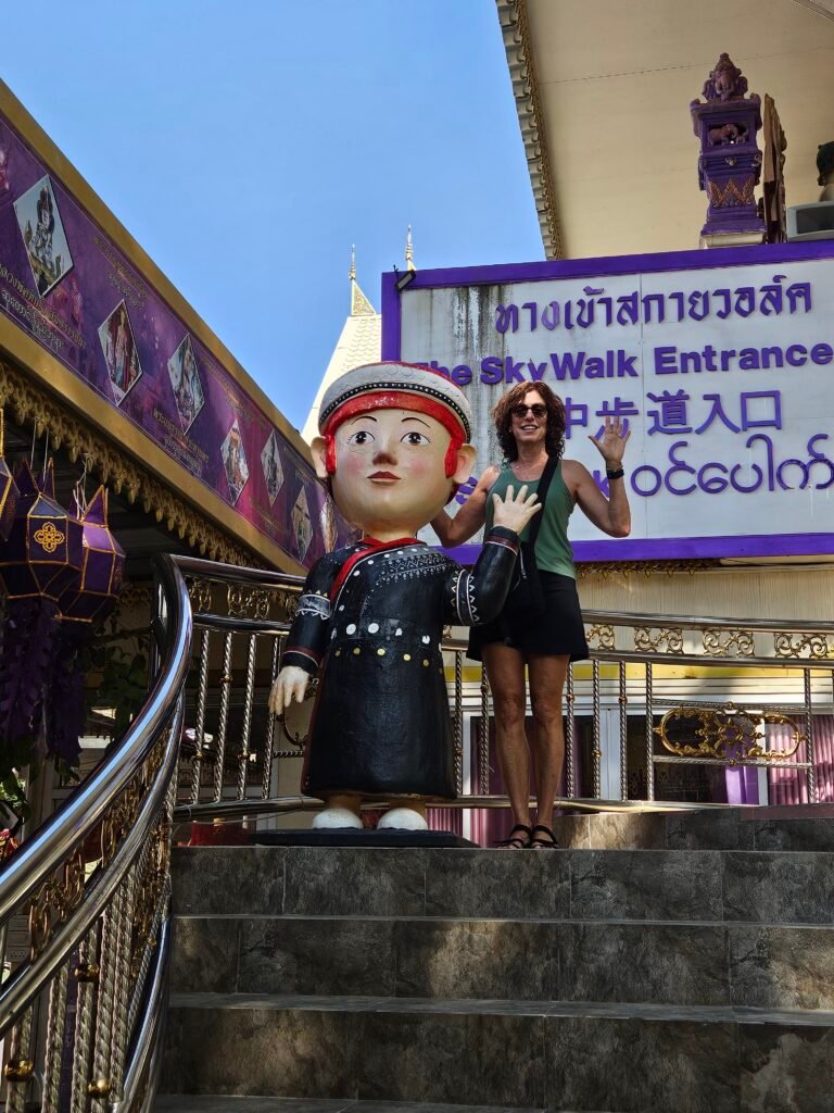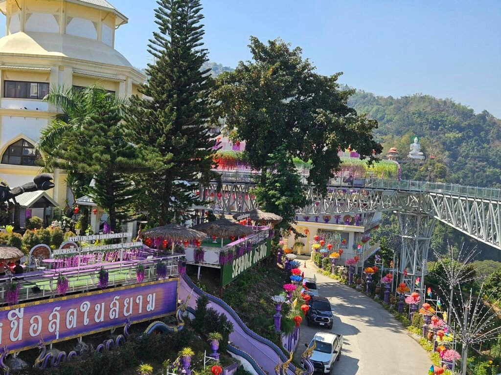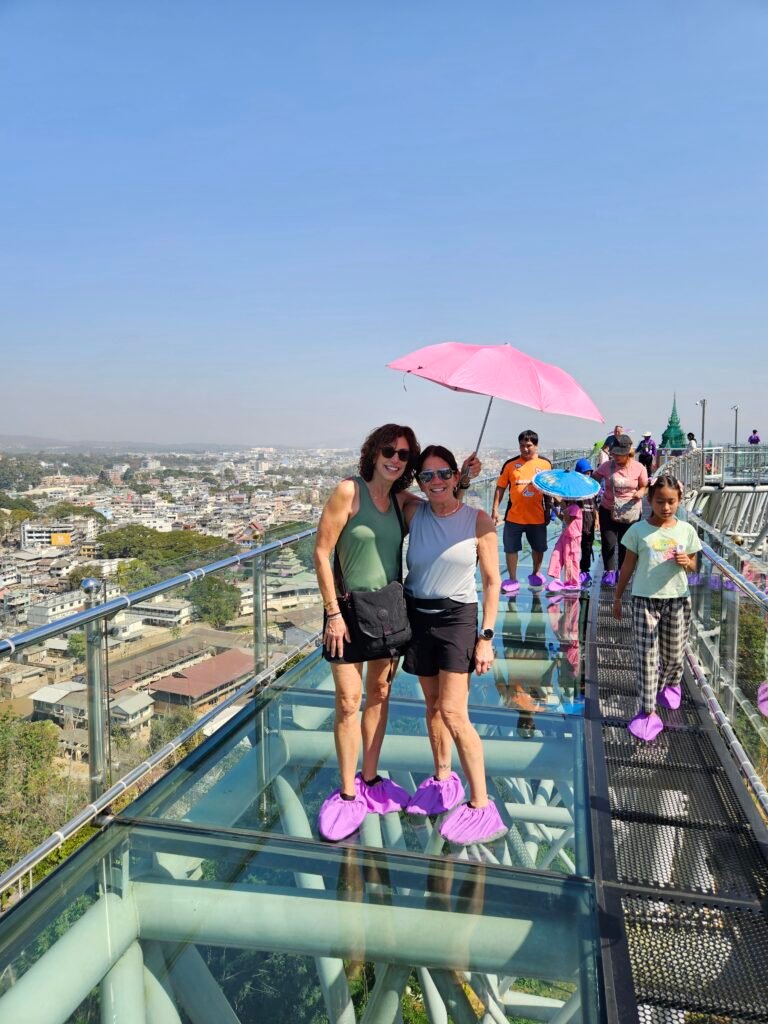 One of the best ways to see the Golden Triangle is a trip to the Skywalk. It is more than a bit scary, but the area before the skywalk is built up and there is a beautiful purple temple after the skywalk. They keep the skywalk so clean, you have to wear purple shoe covers. It reminds me over the Grand Canyon West overlook. Skywalk Mae Sai Border, between Thailand and Myanmar.
