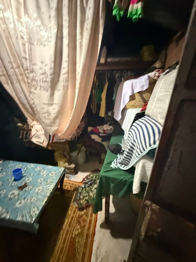 Dwellings are typically small shacks (~12ft × 12ft) built of mud, tin sheets, and dirt floors—often home to large families.
