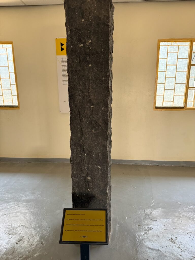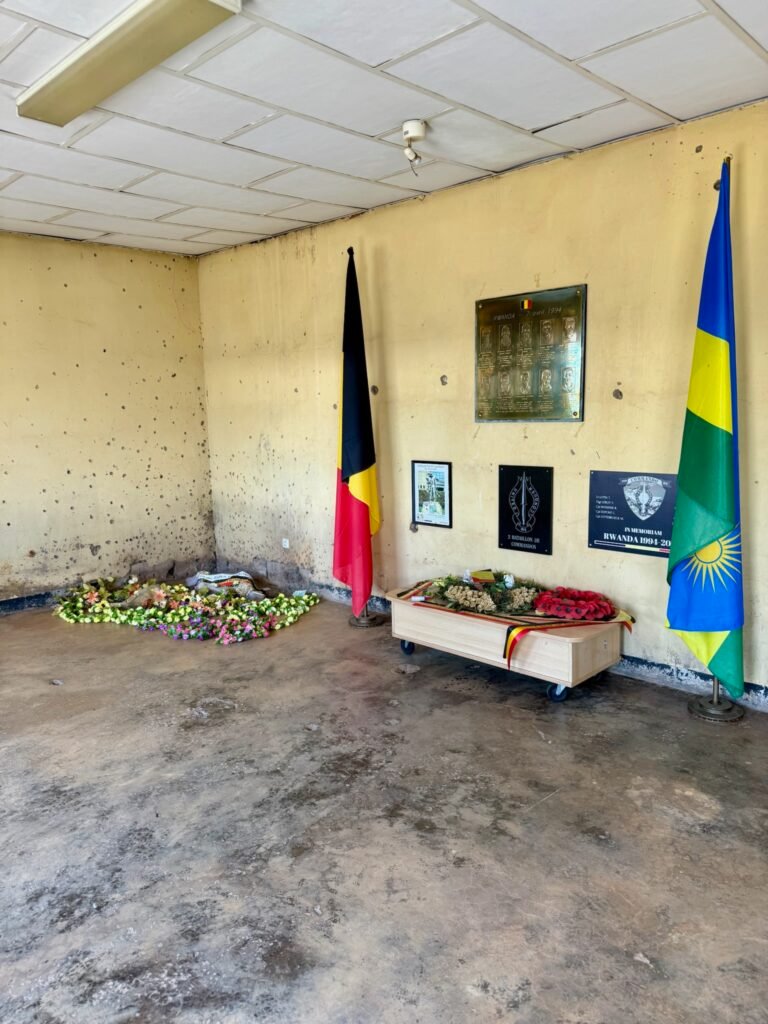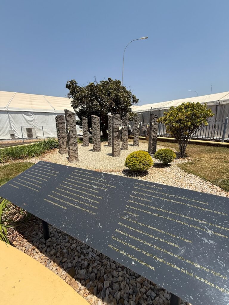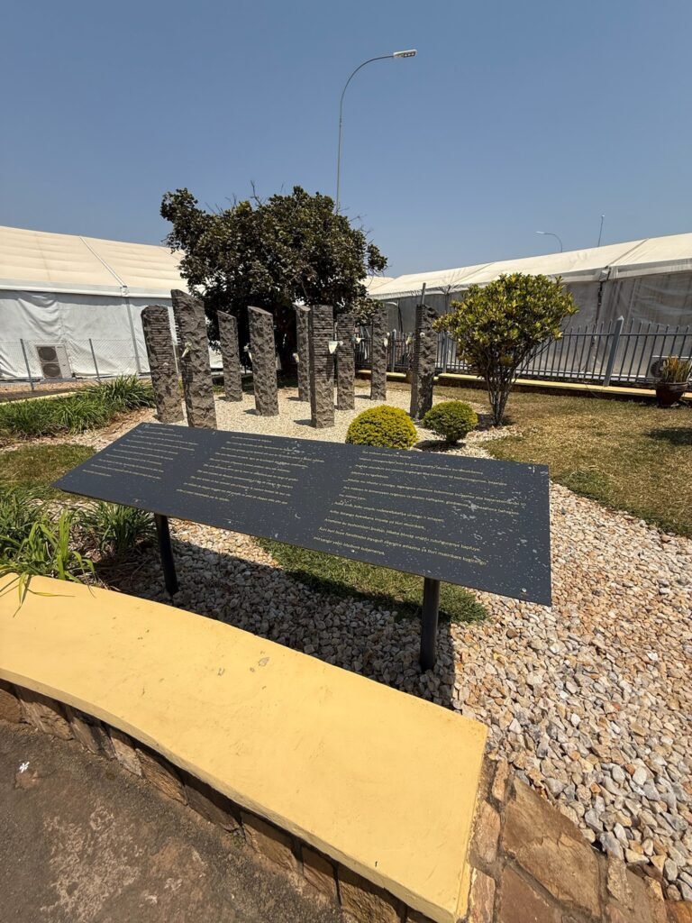 The 10 Belgian soldiers were part of the UNAMIR (United Nations Assistance Mission for Rwanda) peacekeeping mission. They were assigned to protect Rwanda’s Prime Minister, Agathe Uwilingiyimana. After the assassination of President Habyarimana, violence erupted, and the soldiers were captured and killed by the Rwandan Presidential Guard. The 10 stone pillars, each with horizontal cuts representing the age of each soldier.