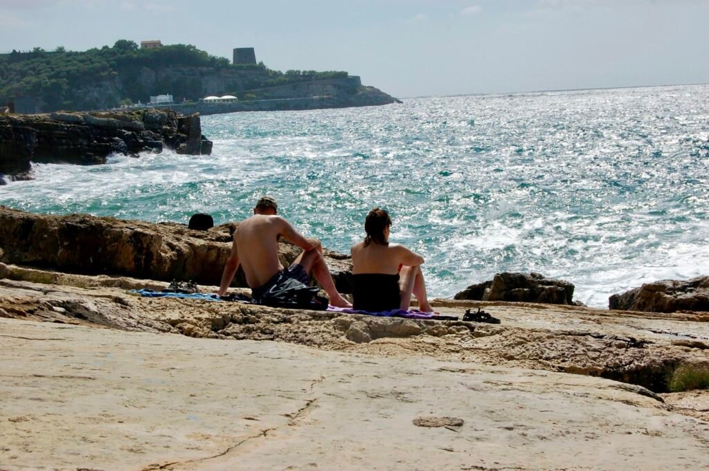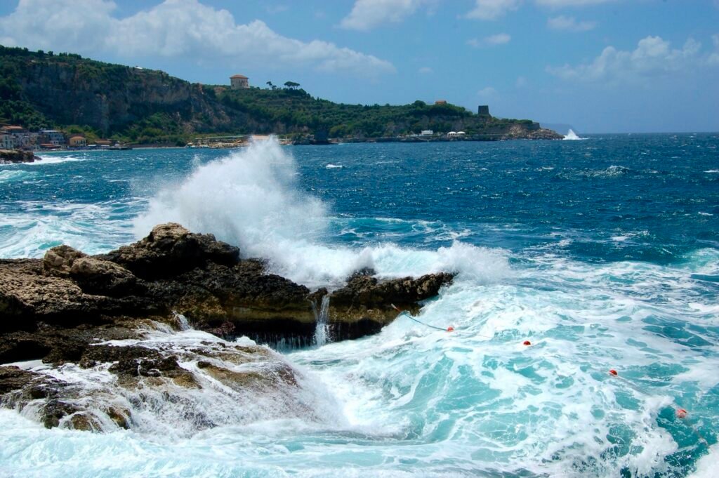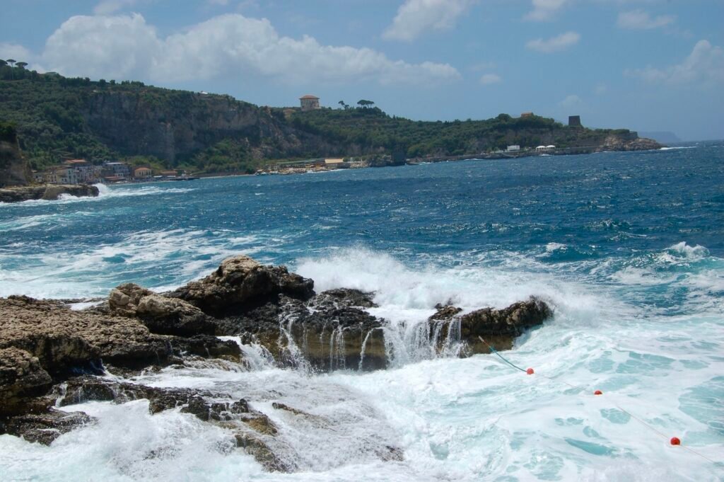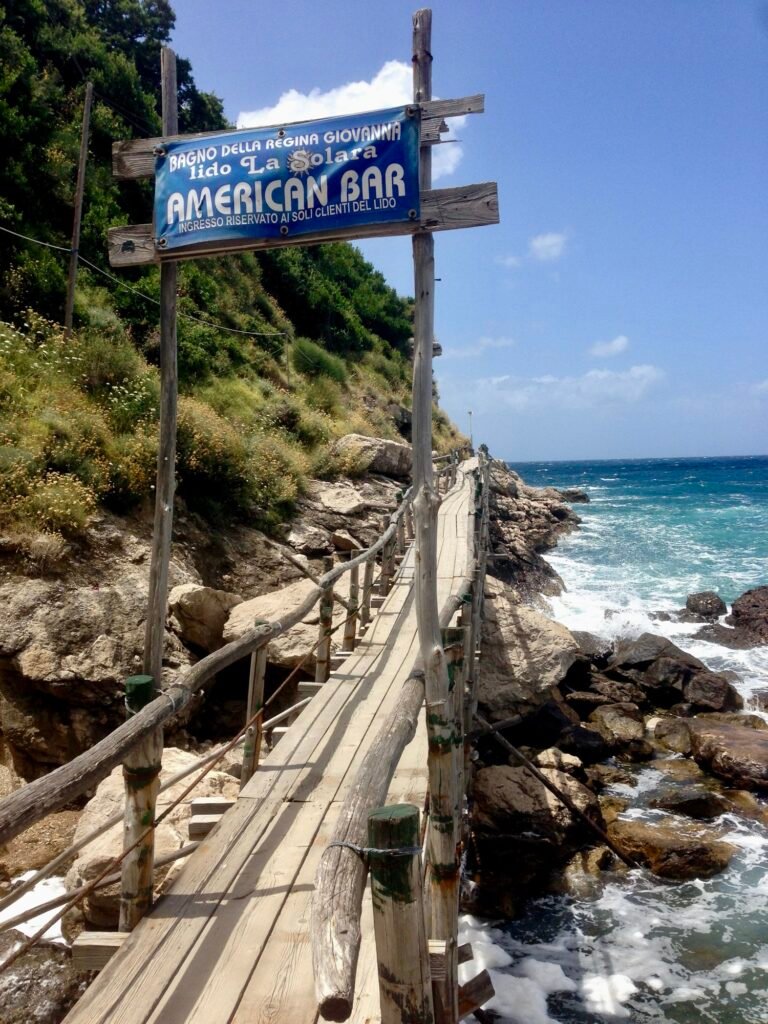 The rocky beach near the American Bar in Sorrento, Italy, is a picturesque spot along the Amalfi Coast. The beach is characterized by its rugged shoreline, with large rocks and pebbles leading into the clear, turquoise waters of the Mediterranean. The cliffs surrounding the area provide stunning views, and the atmosphere is tranquil, with the sound of waves gently crashing against the rocks. The nearby American Bar adds a touch of sophistication, offering refreshing drinks and a comfortable place to relax while enjoying the natural beauty of the Sorrento coastline.